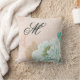 This stylish, pretty floral throw pillow features a pattern of teal (or mint green) flowers in one corner, over a blush pink background. The pattern is reversed on the other side. There is a personalized monogram on both the front and the back which can be personalized to suit.