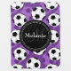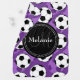 Cool cute chic trendy purple, black and white soccer ball pattern with black nameplate for your custom monogram initial letter and name. Stylish background design featuring a colorful sporty pattern. Great gift for girls that love sports and monogrammed gifts.