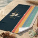 Add a touch of vintage-inspired sophistication to your seaside adventures with this "Modern Retro" beach towel. Featuring a stylish palette of sage, dusty blue, mustard, and coral stripes against a bold navy blue background, this design perfectly blends 70s nostalgia with contemporary minimalism.