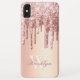 Modern, girly pink rose gold glitter sparkle drips custom personalized name and monogrammed iphone case. This design features blush pink rose gold glitter sparkle drips on pink metal look background with monogram initial and first name text template. Perfect feminine gift. If you need help or matching items, please contact to me.