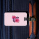 Monogrammed Blush Pink Roses and Dusty Purple Orchids luggage tag. Deep Blush to Cerise Red Roses. Cabernet Sauvignon Purple to Lavender Magenta Orchids with Light Sage Green Accents. Oyster Pink Background with Can Can Pink Border.