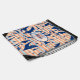 Tropical navy blue palms on orange, tan and baby blue stripes, ready for your name and monogram in chic lettering in any color on transparent white overlay on the front (can be deleted or moved on the layout.) Create for yourself or give as a gift.