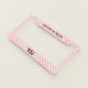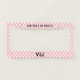 The license plate frame has a pink and white checkerboard pattern. You can personalize the text with your monogram and message.