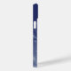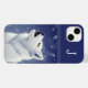 Wolf lovers iPhone case done in blue, with ai cartoon graphics of a white wolf howling in the snow. Personalize the one letter monogram to suit your needs.