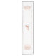 Design features a large, rust-colored initial displayed in center. Design is framed by a coordinating rust-colored flourish and is displayed against a white background. The traditional Catholic prayer before meals is featured at one end, while the traditional Catholic prayer after meals is displayed on the other. All text is customizable.