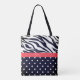 This custom all-over-print tote bag features a mixture of both zebra and polka dot patterns. In the center, there is a red and black monogram that you can personalize using the custom template.