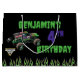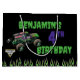 Bring the excitement of Monster Jam to the celebration with this bold birthday design featuring the legendary Grave Digger monster truck. Set against a dramatic black background, the iconic truck appears in vivid detail with its signature skull graphics, neon green flames, and oversized monster tires. The powerful monster truck design captures the thrilling energy of a live Monster Jam event and instantly stands out with its bright green and purple racing colors.