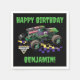 Add thrilling monster truck action to the celebration with this exciting Monster Jam design featuring the legendary Grave Digger truck. Set against a bold black background, the iconic monster truck jumps across the center of the design with its signature skull graphics, bright green flames, and oversized tires, capturing the high-energy excitement fans love. A vibrant purple and yellow checkered racing pattern underneath the truck adds movement and a racing-inspired look that feels straight out of a Monster Jam arena.
