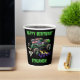 This action-packed Monster Jam design features the legendary Grave Digger monster truck racing across a bold black background with vibrant green slime-style lettering that reads “Happy Birthday.” The iconic truck is illustrated in vivid detail with its signature skull graphics, neon green flames, and oversized monster tires as it launches over a purple and yellow racing pattern that adds motion, color, and excitement to the design. The bright green lettering pops dramatically against the dark background, giving the entire design a thrilling monster truck arena feel.