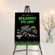Welcome guests to the ultimate monster truck celebration with this exciting Monster Jam birthday welcome design featuring the legendary Grave Digger truck. Set against a bold black background, the iconic monster truck jumps across the design with its signature skull graphics, neon green flames, and oversized monster tires. Beneath the truck, a purple and yellow checkered racing pattern adds motion and high-energy racing style that captures the thrill of a Monster Jam arena.