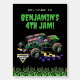 Bright slime-green lettering announces the celebration with a fun “Welcome to the Jam” style message, creating a playful nod to the famous Monster Jam events fans love. The name and age on the design are fully customizable, allowing you to personalize the welcome message for any birthday celebration. A row of glowing green flames stretches across the bottom of the design, adding an edgy monster truck vibe that perfectly matches the bold Grave Digger theme. This exciting design is perfect for greeting guests and setting the stage for an action-packed monster truck birthday party.
