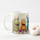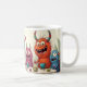 A group of six cheerful, furry monsters with unique features like horns and antennae gather around a table for a festive tea party. They're enjoying colorful cups of tea, a decorative cake, and various treats. The monsters display a range of excited expressions, creating a whimsical and joyful atmosphere.