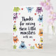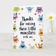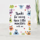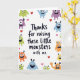 This greeting card features a white background with a centered message that reads, “Thanks for raising these little monsters with me,” in thick, dark lettering that feels casual and affectionate ❤️. Around the text, a ring of cute, cartoon-style little creatures forms a friendly border, as if they’re gathering close to witness a shared inside joke between two partners or close friends. The creatures come in lime green, sky blue, purple, yellow, and orange, giving the scene a cheerful, party-like mix without looking busy. Each one has a simple rounded body, one or two oversized eyes, and a small toothy grin, and a few lift tiny arms in a wave that reads like supportive teamwork. Small hearts in red and light pink are sprinkled between them, adding a soft romantic note to the funny message 🌼. The layout keeps the words as the focal point, with the characters spaced evenly so your eyes move in a circle and back to the center. The text sits in the middle in dark ink, while the hearts and creatures are placed around it like a frame. Several little red and pink hearts float near the corners between the colorful creatures.