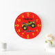 This fun customized wall clock is perfect for truck lovers. It has a design with a cartoon monster truck. The truck is yellow with flames. You can change the background color to any you want.