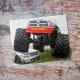 Big, red monster truck is smashing an auto salvage car. Cool for all truck lovers.