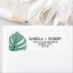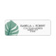 Botanical elegant return address labels in classic black sans serif font on white background aligned a modern illustration of a green monstera leaf.