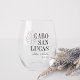 Impress your destination wedding guests with these chic and modern personalized stemless wine glass wedding favors. Design features a dark green monstera leaf illustration with your wedding destination aligned at the right (shown with Cabo San Lucas) in classic serif lettering. Add your names beneath in handwritten cursive script, as well as the year. Leaf position can be adjusted, and colors can be changed to match your wedding colors using Zazzle's design tool.