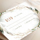 This RSVP card is perfect for your guests to confirm their attendance at your upcoming wedding. The design features a whimsical and bohemian style, with a faux-gold framing, faint sage-green monstera botanicals, and faux-gold blobs. The card is printed on high-quality stock and can be easily included with your invitation or mailed separately to your guests. The front of the card features a geometric faux-gold border and whimsical greenery, setting the tone for your special day. The front of the card also includes a space for your guests to indicate their attendance and any additional information, such as meal preferences. The back of the card is adorned with a beautiful faux-gold pattern, adding the perfect finishing touch to this one-of-a-kind design. Whether you're having a traditional or bohemian wedding, this RSVP card is a convenient and stylish way for your guests to let you know if they will be able to attend your special day.