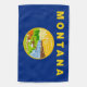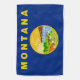 The Montana State Flag features the Great Seal of the State of Montana on a blue background. The seal depicts a plow, shovel, and pick resting in a field in front of the Great Falls of the Missouri River. The ribbon contains the state motto, "ORO Y PLATA," Spanish for "gold and silver." The word "MONTANA" appears in yellow above the seal.