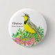 A button pin decorated with a bright yellow western meadowlark perched on a sagebrush plant mingling with a soft pink bitterroot wildflower drawn with ink and painted with watercolor. Inspired by the state bird and state flower of Montana.