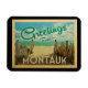 This Greetings From Montauk vintage postcard design features a sandy beach with a beautiful turquoise ocean water and above the sea, a blue sky with billowy white clouds. In vintage travels style.