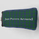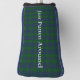 Handsome putter golf club cover done in the classic green and blue clan Montgomery tartan plaid pattern. Light gray text reads, Just Putten Around, and can be personalized to read what you want.