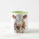 A white mug with a realistic print of a cow’s face and markings, providing a unique and eye-catching design for beverage enjoyment