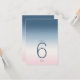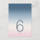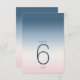 The background for all the pieces in this minimalist wedding set is an eye-catching gradient of colors from prussian blue through soft pink and white. The wedding table numbers card shown here features a sleek, modern layout and contemporary sans serif font to add to it's appeal. Easily add table numbers, initials and wedding date using the provided template. Search ID741 to see the complete set of matching products in Prussian Sky or choose one of the other available gradient combinations to suit your wedding color palette.