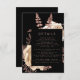 This elegant, moody wedding details enclosure card features a lush, romantic floral bouquet in ivory with rose gold faux foil and glitter foliage on a black background. Customize the rose pink text in stylish fonts on a black rectangle. The back of the card is solid black.