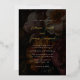 A fine art moody florals gold foil wedding invitation template with beautiful backdrop of dark florals under a black overlay, elegant font mix of a calligraphy script font and a serif font for names and wedding details. The back shows a fall flower bouquet in the style of a baroque oil painting with warm fall autumn colors.