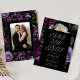 Elegant moody floral wedding save the dates featuring a background of purple, ivory, and burgundy flowers with lush green foliage on a black background. "Save The Date" is displayed in elegant, modern typography. Personalize the purple floral save the dates with your names, wedding date, and location. The card reverses to display your vertical engagement photo framed in black with a purple floral pattern. The design coordinates with our Moody Gothic Floral wedding collection.