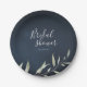 Modern minimal watercolor botanical foliage greenery design on moody navy blue background, simple and elegant, great paper plate for modern bridal shower, rustic botanical wedding, and baby shower party in summer and fall.