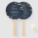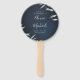 Modern chic minimal watercolor botanical foliage greenery design on moody navy blue background, simple and elegant with calligraphy names, great round wedding program fans for modern wedding, rustic wedding, and botanical garden wedding in summer and fall at night.