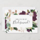 This moody purple blooms will you be my bridesmaid card is perfect for a modern wedding. The elegant floral design features dark plum purple and white tulip flowers with emerald green leaves and gold leaf accents. Customize the card with the name of the bride and the bridesmaid. Personalize the back of the card with a personalized message.