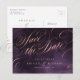 Romantic handwriting calligraphy script in faux rose gold color on moody deep purple watercolor background, elegant and sophisticated, great wedding save the date postcards for vintage wedding, fall or winter weddings and evening wedding.