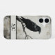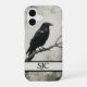 Set the tone for a mysterious dark academia aesthetic with this personalized monogram phone case. It features a detailed black crow illustration perched on a rustic branch, rendered in a striking monochrome palette with vintage ink textures. This is the perfect way to elevate your everyday tech or a thoughtful gift for a gothic art lover.