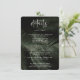 Moody Tropics, wedding details card. Dark tropical palm frond photography. Features, white bold and edgy typography. Black backing color.