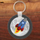 A red, blue and gray catoon rocketship, engines firing, crosses over the moon in dark space.