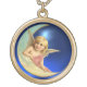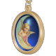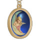 Whimsical cute blonde haired ,blue eyed romantic angel hanging on the Moon with a bright 3D Blue Sapphire gem stone.
