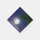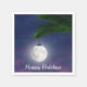 Glowing full moon Christmas ornament hanging from tropical palm tree frond on starry sky background.