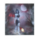 A dark fantasy scene featuring a mysterious, seductive demoness standing beneath a blood-red moon. Her icy blue skin contrasts sharply with her dark hair and crimson bat-like wings, evoking a haunting beauty. Clad in a gothic outfit with tribal markings, she grips a flaming broom, ready to summon otherworldly forces. Twisted trees and a misty night sky surround her, creating an eerie, magical atmosphere.