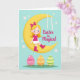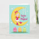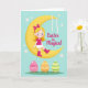 This design shows a stylized young girl with bright blonde hair and a pink striped bow sitting on a glowing golden crescent moon, her wide eyes turned outward as if sharing a quiet, friendly secret. She wears a magenta top, a white skirt, and rosy boots, and her relaxed pose adds a gentle, affectionate tone to the scene. From the moon, thin white bead-like strands hang down like tiny garlands, adding a soft sparkle above the spring setting 🌷. The background is a light blue sky scattered with white stars in different sizes, giving the whole image an airy, dreamy look. Along the bottom, a strip of green grass supports three decorated egg shapes that feel like they’ve been arranged with care, side by side like companions. The first egg is pink with white stars and stripes, the second is orange with white dots and stripes, and the third is green with white and yellow stripes 🐰. A festive message appears in pink lettering near the upper portion of the design, standing out against the pale sky. The golden crescent moon sits centered above the grassy strip, with the dangling white strands reaching toward the trio of patterned eggs.