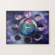 Adorn your space with this mystical Moon Phase Chart puzzle, featuring a stunning depiction of the moon’s phases surrounding a radiant Tree of Life. This cosmic design showcases vibrant purple and teal tones, a starry galaxy background, and clear labeling of each moon phase (New Moon, Full Moon, etc.).