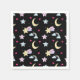 A pattern with happy stars, moon, clouds and rainbows on a pink background.