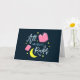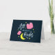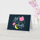 Perfect for book lovers, this bookish greeting card features the words "All Night Reader" surrounded by yellow moon and stars and pink books against a dark blue background.