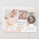 A fun yet elegant birth announcement design featuring a 3-photo collage with stylish calligraphy script and hand-drawn stars, clouds, and crescent moon. All colors are editable using the editing tools.