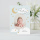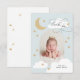 A playful yet elegant thank you design featuring your photo in an arch shape with stylish calligraphy script and hand-drawn stars, clouds, and a crescent moon. The back features more stars.