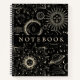 This stunning black spiral notebook combines the allure of vintage design with a touch of celestial wonder, making it an ideal companion for anyone with a passion for the mystical, the magical, and the cosmic. The cover features a beautifully intricate pattern of antique-looking suns, moons, planets, and geometric symbols, all set against a deep black background that makes the details pop. The word "Notebook" appears above this mesmerizing pattern in a retro font, bridging the gap between ancient artistry and modern functionality. Whether you're writing, journaling, or sketching, this notebook invites you to connect with the universe in a way that’s as practical as it is enchanting.