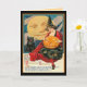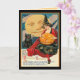 Pretty vintage witch holding a pumpkin beside her black cat with a happy moon behind her. Inside text says Halloween Greetings and can be customized by you.