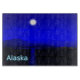 Moonrise in the Inside Passage off the coat of Alaska. Mountains in the distance and a fishing boat heads north. Text reading "Alaska" appears in glowing blue and white.
